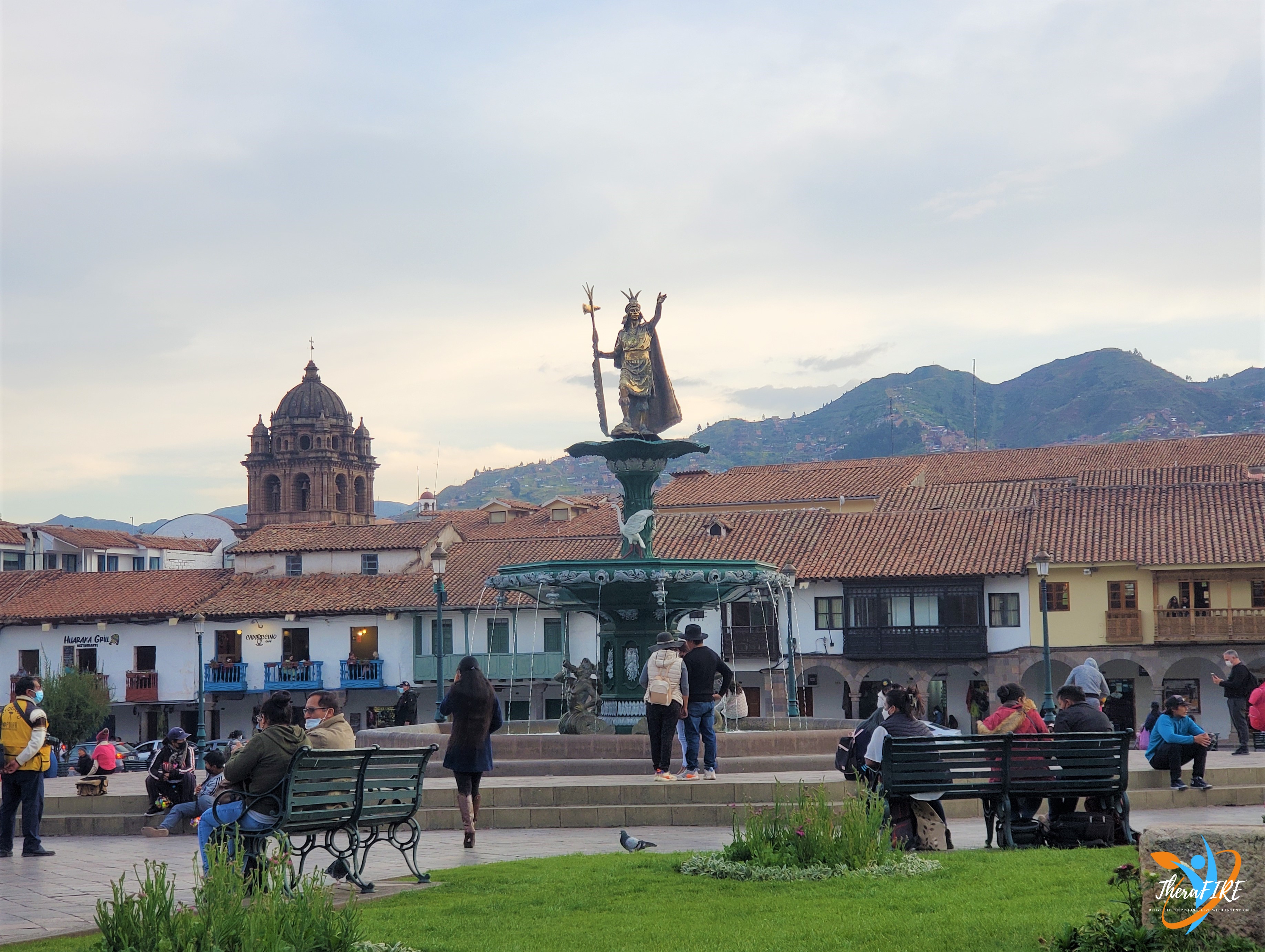 At the center of Plaza de Armas is a swan fountain and a gilded statue of Pachacútec, the 9th and most important Inca ruler. Lush lawn, manicured trees and beautiful flowers decorate the plaza, enclosed by rows of green benches on stone cut walkways.
