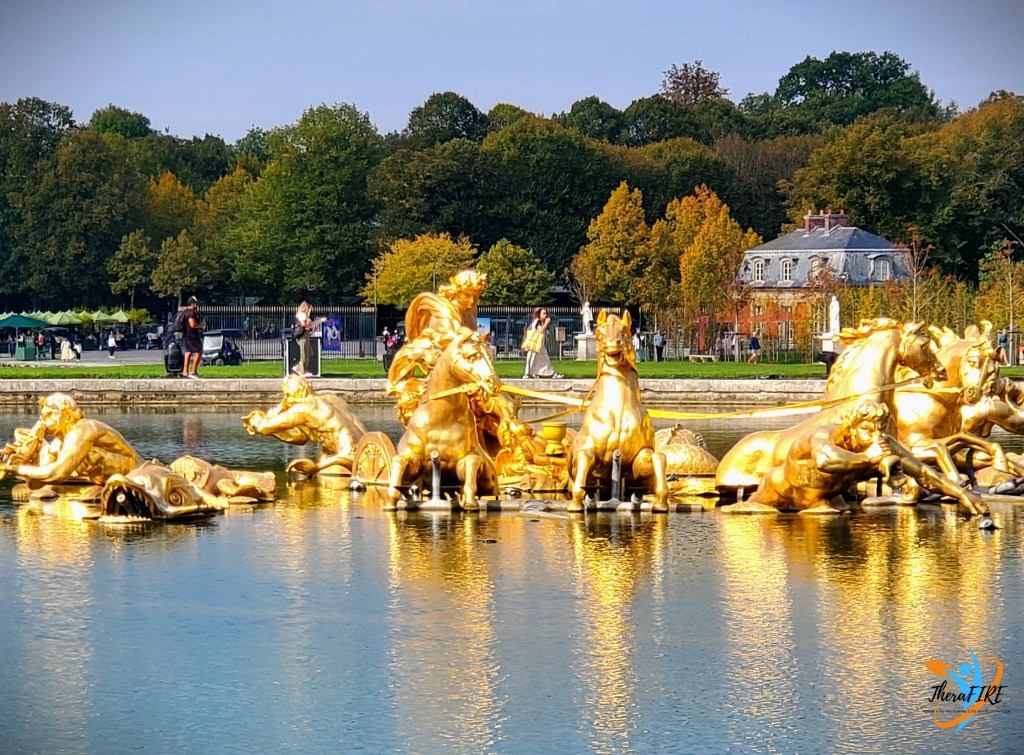 As we strolled, we encountered the playful Bassin des Enfants Dorés (Fountain with Golden Frogs). Then, we were captivated by the Latona Fountain. It depicts the myth of Latona, the mother of Apollo and Diana. She was exhausted and thirsty. Along with Jupiter’s twins, she stopped at a pond in Lycia to drink. The local peasants refused to let her drink. In anger, she called upon Jupiter for help, and he transformed the cruel peasants into frogs! The fountain captures this moment. Latona and her children are surrounded by figures in various stages of transformation. These figures change from humans to frogs.