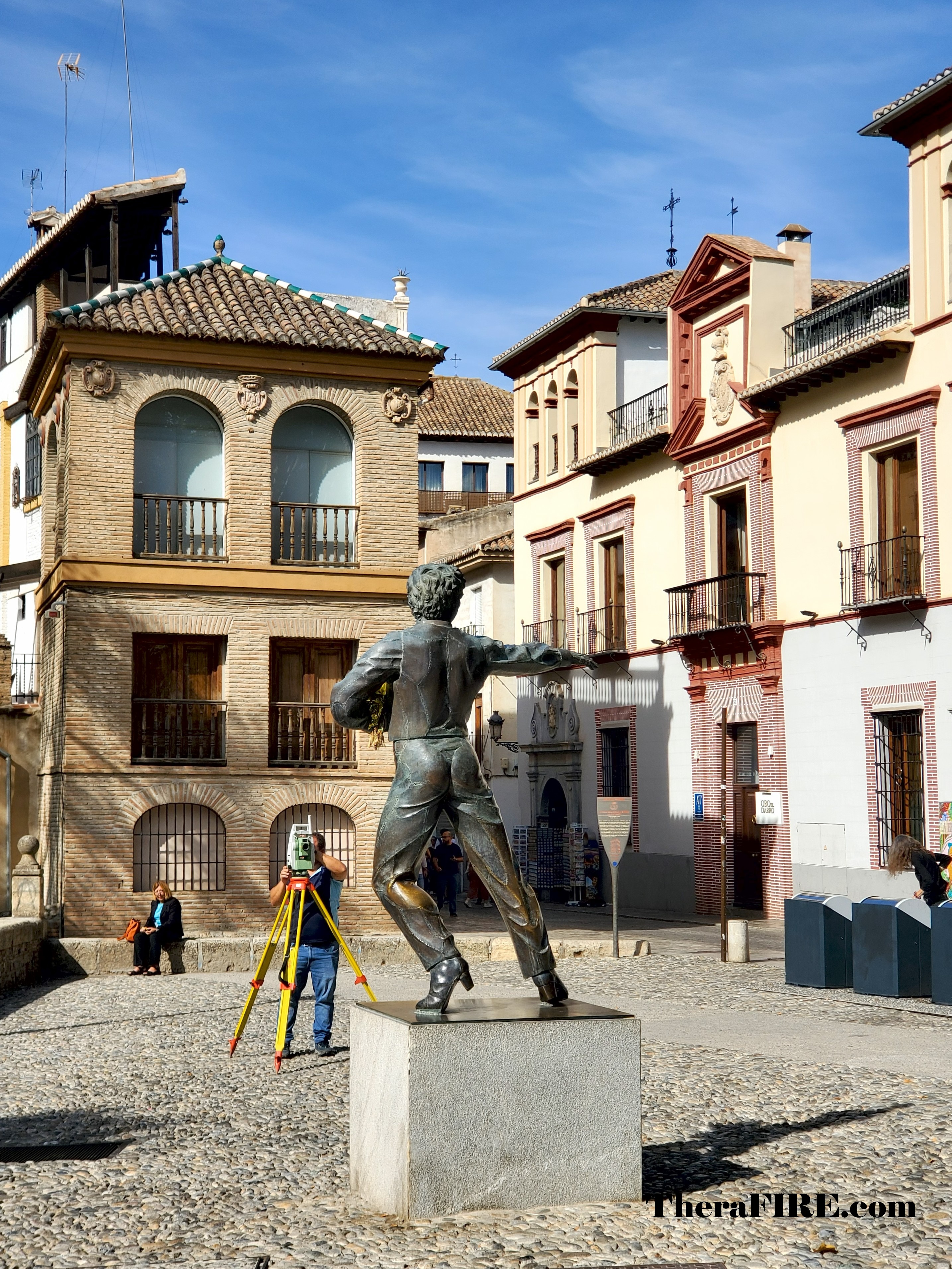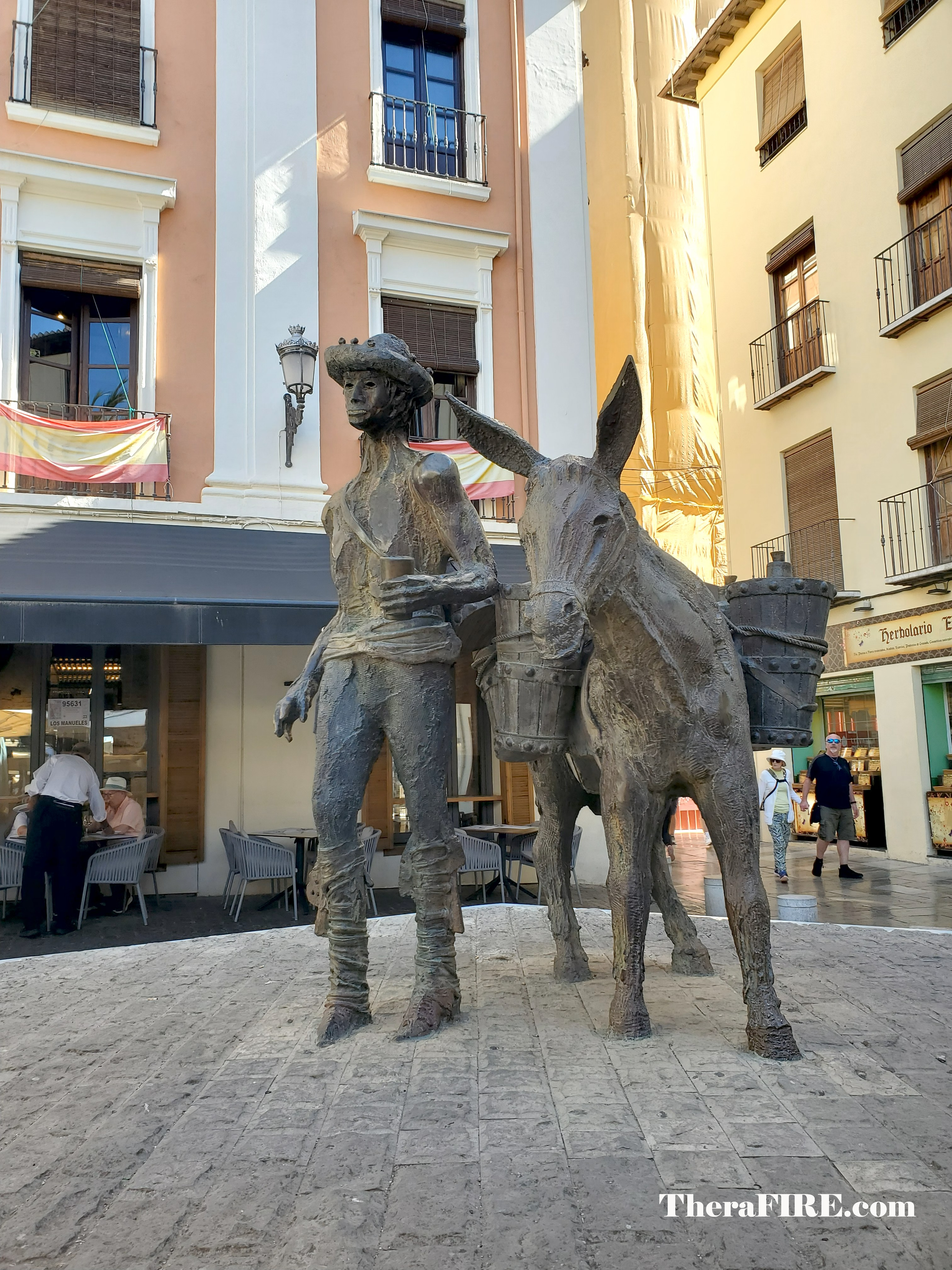 Granada’s Historic Center, bathed in the morning sun, was opulent and amicable at the same time. Surrounding the Royal Chapel and Cathedral complex are mazes of cobblestone streets with cafes, restaurants, and ancient Arab Bazaars. We unwrapped our packed lunch and take-out coffee in the Plaza de la Romanilla, a tranquil square tucked away behind the main facade of the Granada Cathedral. A notable feature of the square is the Aguador, a statue honoring the traditional water carriers of Granada.